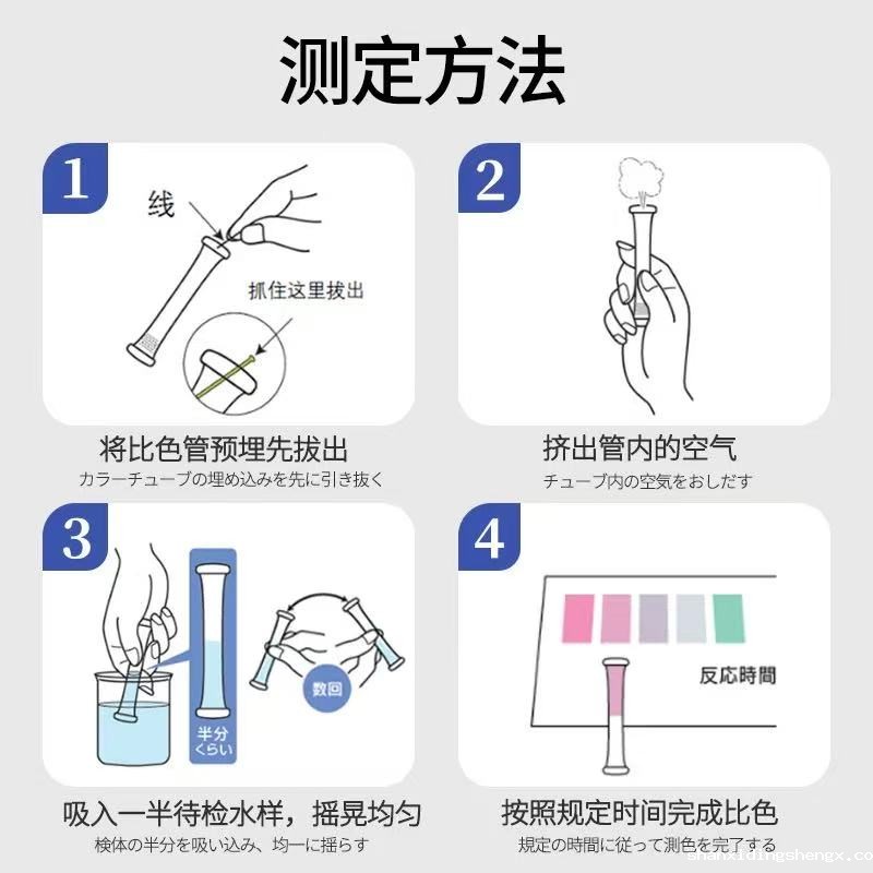 是利用一支长度约为7公分外径1公分的PE塑胶制封闭性试管内部装填了一次测定所需要用量的调制试药.使用时先将试管前端的预埋线拉出再吸入欲测定的液体样本,待水溶液与试药反应发色后于时间内比对标准色卡,判读其浓度值.