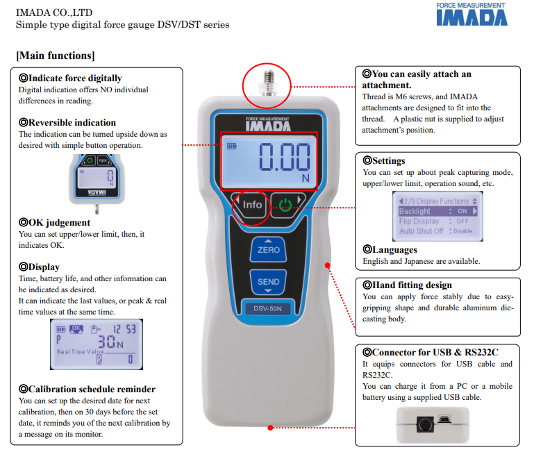 标准型数字测力计量程为1000N,操作简便,功能强大,采用2000Hz高速采样,可实现精确的峰值测量和平滑的数据曲线。配套软件支持通过PC进行数据管理,并提供绘图软件进行详细的数据分析。该测力计提供多种外部输出接口,可连接各种设备。下一代数字测力计固件版本为Ver.5或更高版本,测量稳定性更高,噪声更低。用户可从专用网站(IMADA Connected)下载可选功能和软件,但部分功能需要连接另售产品才能使用。