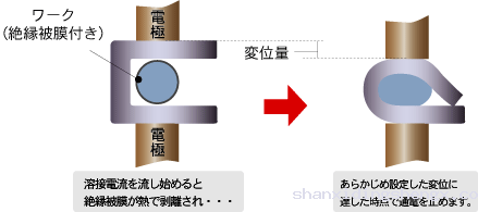 电极位移(熔深)预先通过焊接检测器(带位移监测功能)设定。当位移量达到设定值时,输出中断信号并停止电流,从而实现以稳定的位移量进行熔合。
