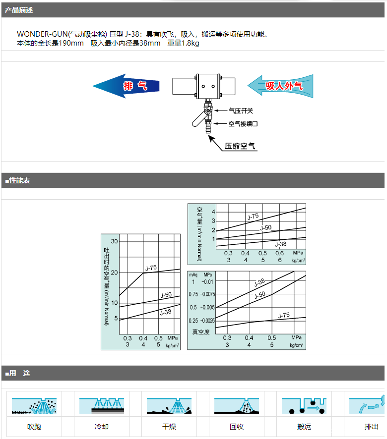 产品简介: WONDER-GUN(气动吸尘枪) 巨型 J-38:具有吹飞,吸入,搬运等多项使用功能。 本体的全长是190mm 吸入最小内径是38mm 重量1.8kg