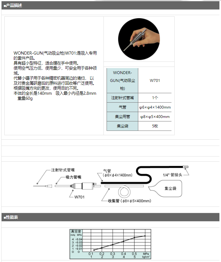 产品简介: WONDER-GUN(气动吸尘枪)W701:是吸入专用的套件产品。 具有超小型特征,适合握在手中使用。 使用空气压力低,使用量少,可安全用于各种领域。
