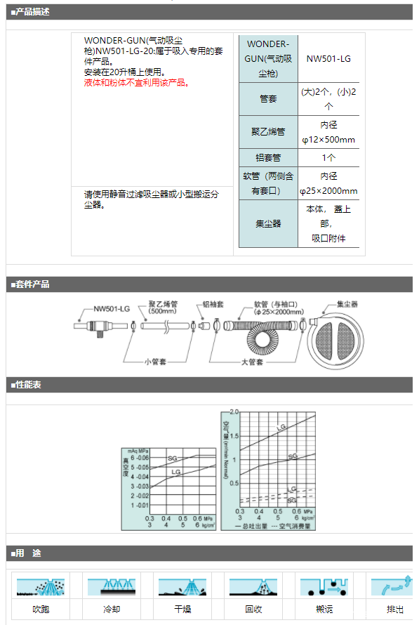 产品简介: WONDER-GUN(气动吸尘枪)NW501-LG-20:属于吸入专用的套件产品。 安装在20升桶上使用。 液体和粉体不宜利用该产品。
