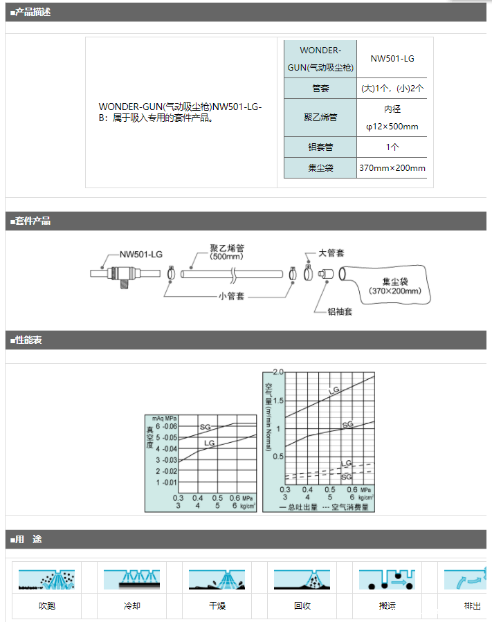 产品简介: WONDER-GUN(气动吸尘枪)NW501-LG-B:属于吸入专用的套件产品。