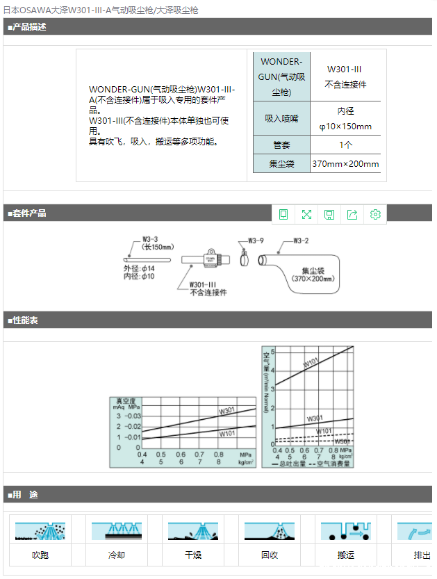 产品简介: WONDER-GUN(气动吸尘枪)W301-III-A(不含连接件)属于吸入专用的套件产品。 W301-III(不含连接件)本体单独也可使用。 具有吹飞,吸入,搬运等多项功能。