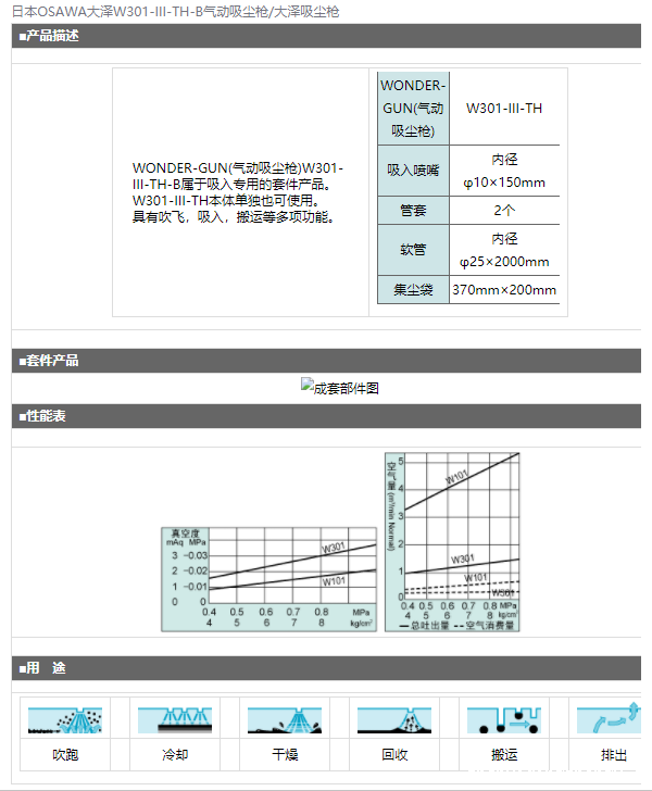 日本OSAWA大泽W301-III-TH-B气动吸尘枪