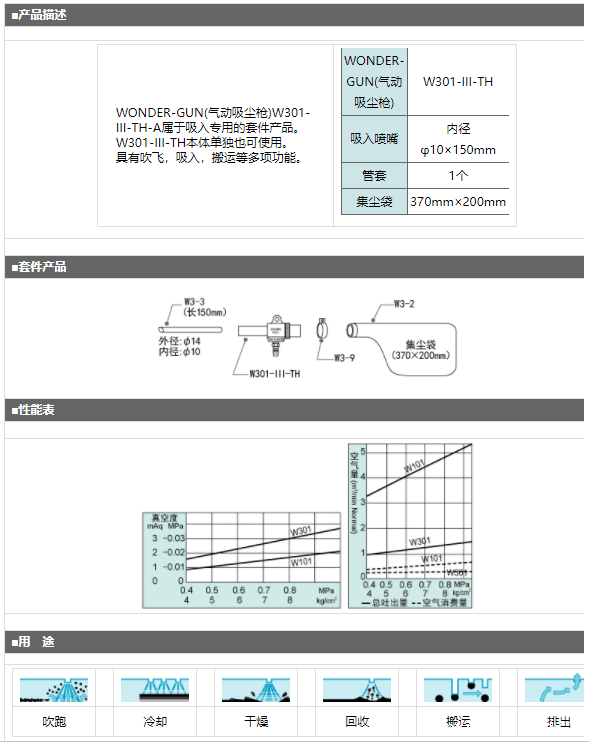产品简介: WONDER-GUN(气动吸尘枪)W301-III-TH-A属于吸入专用的套件产品。 W301-III-TH本体单独也可使用。 具有吹飞,吸入,搬运等多项功能。