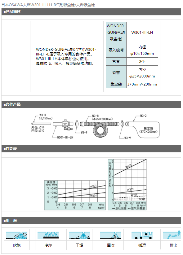 产品简介: WONDER-GUN(气动吸尘枪)W301-III-LH-B属于吸入专用的套件产品。 W301-III-LH本体单独也可使用。 具有吹飞,吸入,搬运等多项功能。