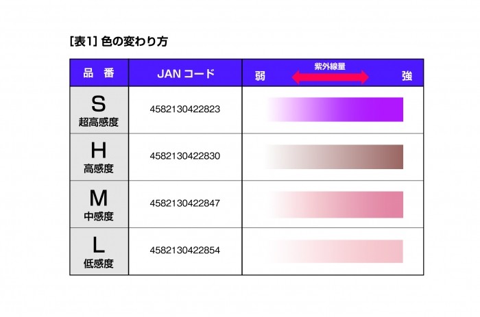 当接收紫外线时,它可以从无色变色,并且可以通过颜色变化确认UV照射。变色是不可逆的,一旦变色就不会恢复。