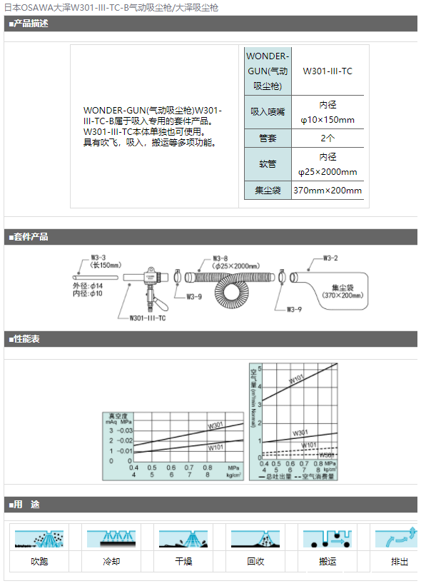 产品简介: WONDER-GUN(气动吸尘枪)W301-III-TC-B属于吸入专用的套件产品。 W301-III-TC本体单独也可使用。 具有吹飞,吸入,搬运等多项功能。