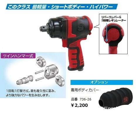 产品简介: 重量轻,扭矩大! 红色和黑色的配色方案在车库中熠熠生辉! 专门的气动冲击扳手“ SI-1600B ULTRA” 值得信赖的制造商“ SHINANO”生产的12.7mm方形超微型冲击扳手。 它具有460 Nm的一流领先的高扭矩,1.04 kg的最轻级和148 mm的短体, 是经过精心选择的高品质冲击扳手,并有力地支持了车库的使用寿命。