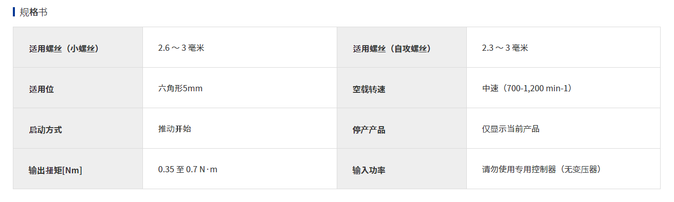 高性能Derubo的长期●节省空间:另一个地方控制器是不必要●推开始:理想的平滑连续工作的高重复性通过●自己离合器机构和自动停止电路的组合,实现了倒钩精度●对应于各种定制的启动方法:按键启动输入电压:AC100V扭矩调节:无级输出扭矩[Nm]:0.35至0.75转速[rpm / min]:1,000功耗[W]:35兼容螺钉[mm]:2.6至3兼容钻头:平整5mm六角批头质量[kg]:0.69