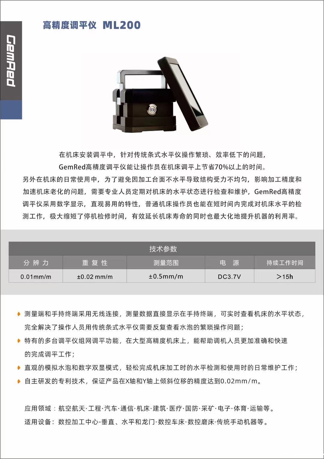 产品简介: 国产角度计GEMRED高精度调平仪ML200 测量端和手持终端采用无线连接,测量数据直接显示在手持终端,可实时查看机床的水平状态,完全解决了操作人员用传统条式水平仪需要反复查看水泡的繁琐操作问题;