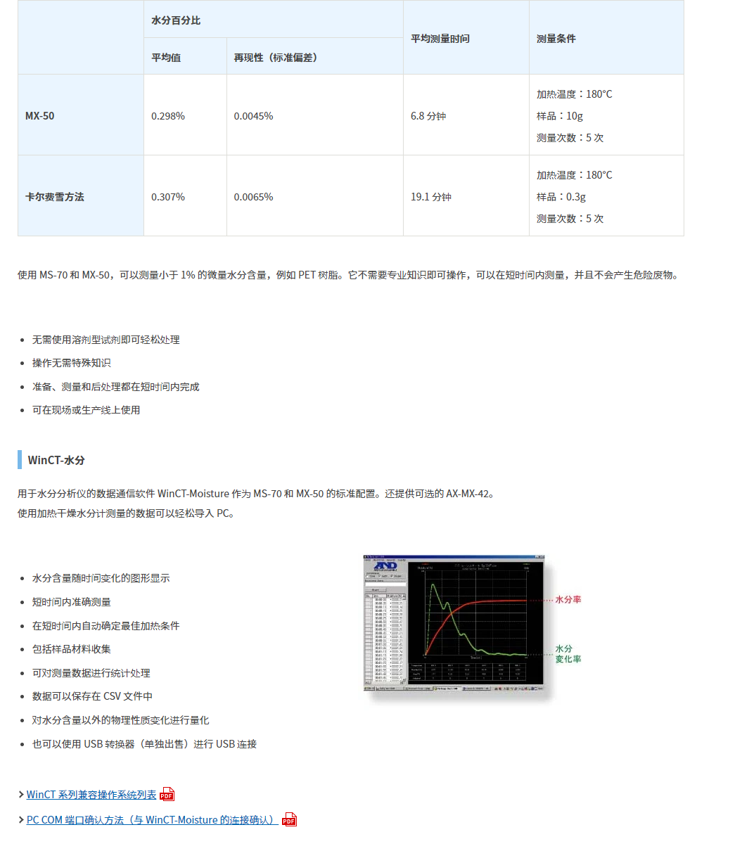 配备质量传感器系统SHS采用直管式卤素灯和新机构SRA,实现高速均匀加热MS-70/MX-50标配数据通讯软件WinCT-MoistureRS-232C接口(D-Sub25P母头)标准设备MS-70/MX-50可校准加热温度包括水分含量准确性确认样品(不包括 ML-50)标准/快速/自动结束/定时器/手动模式可选数据存储器数量每个样品的测量条件:多 20 个(MS/MX)、10 个(MF)、5 个(ML)批量输出:多 100 个(MS/MX)、50 个(MF)、30 个(ML)符合 GLP/GMP/GCP/ISO 的输出大型荧光显示器卤素灯可由用户拆卸和更换。样品盘可清洗并可重复使用
