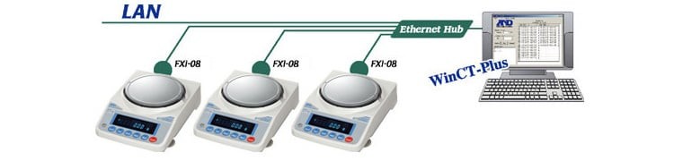 通过使用以太网接口(FXi-08,另售),可以与局域网上的计算机进行双向通信,并且可以将来自多台天平的数据导入一台计算机。