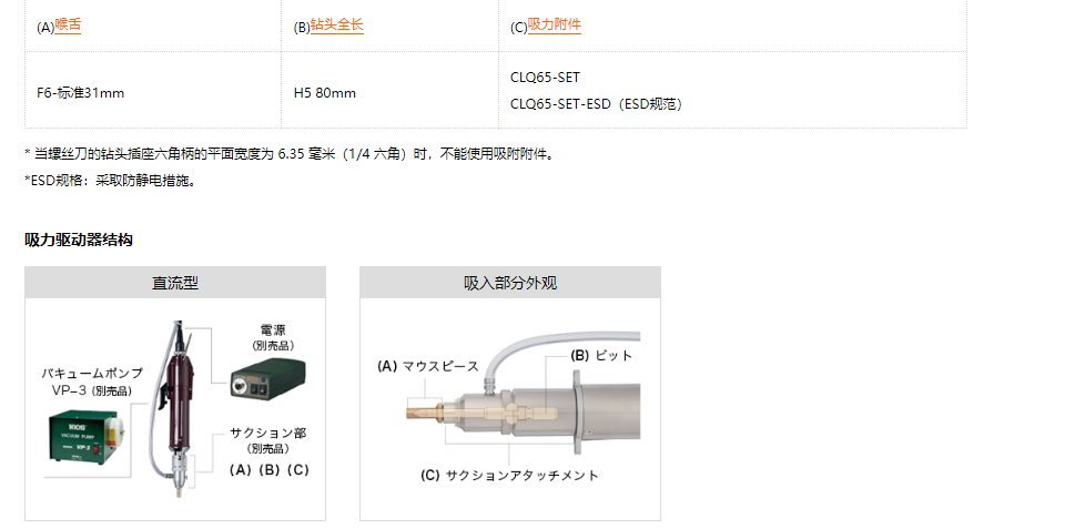 产品简介: 负压吸住螺丝,省去了捡螺丝的麻烦。也可吸附不锈钢等有色金属螺丝,高效作业。也可以去除螺丝拧紧过程中产生的灰尘。订购时订购吸力型时,请分别购买(A)和(B)。如果您想将您现有的螺丝刀改成吸气式,请单独购买(A) (B) (C)。A) 和 (B) 有多种尺寸可供选择,具体取决于所使用的螺钉尺寸。