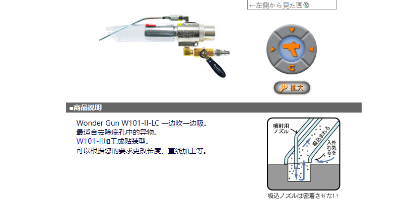 产品简介: Wonder Gun W101-II-LC 一边吹一边吸。最适合去除底孔中的异物。W101-II加工成贴装型。可以根据您的要求更改长度、直线加工等。以压缩空气(compressed air)为动力源,这是一款独特的气枪,可一机三用(业内首创):既可吹气,又可吸气和输送。 我们有多种产品可以满足您的需求,例如可以代替镊子使用的超紧凑型铅笔型,最适合从细小区域收集灰尘,以及可以进行全面喷砂的鼓风型. 尤其是螺旋喷射式产品,有效利用压缩空气作为动力源,枪内完全呈圆柱形,无障碍物,完全不用担心吸运过程中有物体堵塞内部。