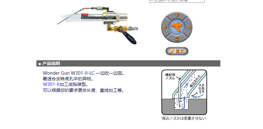加工成贴装型。可以根据您的要求更改长度、直线加工等。OSAWA泽吸尘枪W301的小内径小于 W101。与W101一样,它是一款以压缩空气为动力源,可吹、吸、运的气枪。