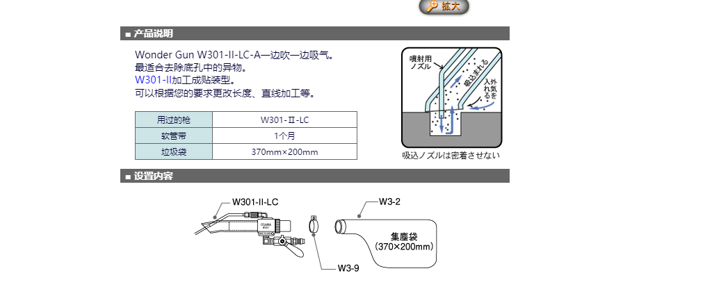 加工成贴装型。可以根据您的要求更改长度、直线加工等。OSAWA泽吸尘枪W301的小内径小于 W101。与W101一样,它是一款以压缩空气为动力源,可吹、吸、运的气枪。