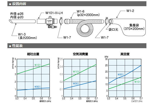 产品简介: W101-Ⅲ-LH-B是一套用于抽吸的装置。W101-III(无软管接头)可单独使用。请用它来吹、吸、运。大泽的吹气方向安装吸嘴,压缩空气流动,沿“A”方向呈螺旋状喷出。由于这个动作,大量的外部空气被从“B”吸入并与压缩空气结合,可以喷出大量的空气。在吸入方向安装有吸嘴,压缩空气沿“B”方向呈螺旋状喷射。这个动作从“A”处吸取了大量的外界空气,可用于运输和清洁。