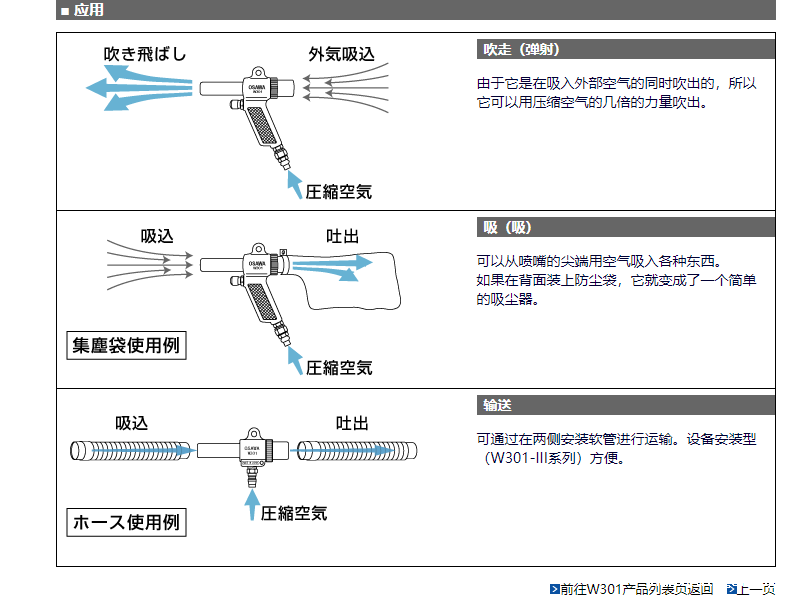 日本进口大泽W301-Ⅲ-LC-A是吸力套装。W301-III-LC主机也可以单独使用。请用它来吹、吸、运。螺旋喷射方式有效利用空气,枪内部为无障碍物的圆柱体,完全不用担心被吸。它是一个小内径为Φ11的圆柱体,通过改变内部吸嘴的方向,既可用于吹气和吸气,又可用于输送、收集、冷却和排气。此外,枪的形状使其易于握持且易于操作。它可用于广泛的用途,例如清洁切削粉尘和输送颗粒。