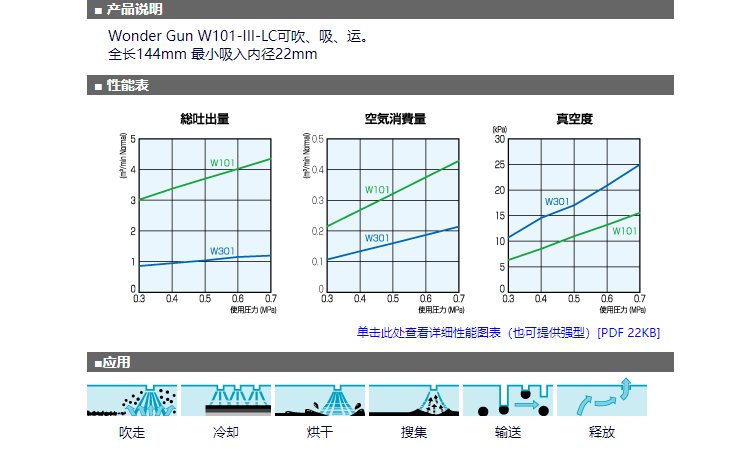 日本进口大泽W101-III-LC可吹、吸、运。全长144mm 小吸入内径22mm它是一个小内径为φ22的圆柱体,通过改变内部吸嘴的方向,它不仅可以用于吹气和吸气,还可以用于输送、收集、冷却和排气。此外,枪的形状使其易于握持且易于操作。