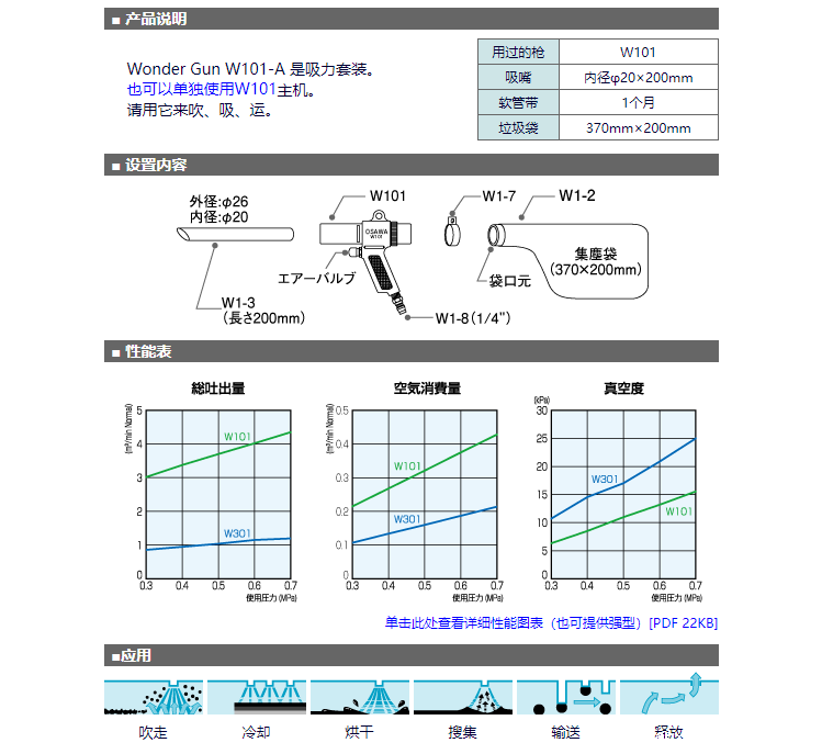 日本大泽W101-A 是吸力套装。也可以单独使用W101主机。请用它来吹、吸、运。它是一个小内径为φ22的圆柱体,通过改变内部吸嘴的方向,它不仅可以用于吹气和吸气,还可以用于输送、收集、冷却和排气。此外,枪的形状使其易于握持且易于操作。它可用于广泛的用途,例如清洁切削粉尘和输送颗粒。