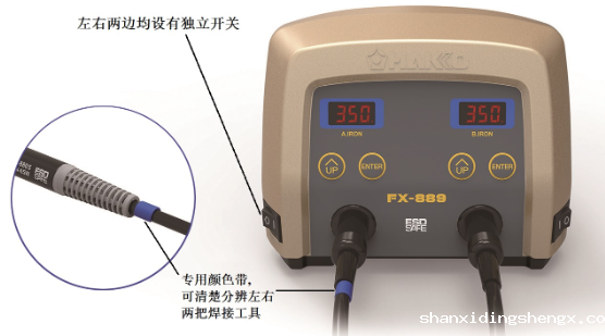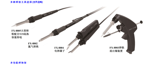 hakko白光FX889拆消静电电焊台双插座设计, 可同时连接两种焊接工具。全新省电及独立开关设计。丰富种类的焊接工具选择。焊台操作简洁、焊铁架功能多样化。