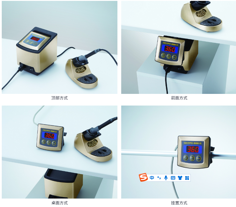 白光FX890拆消静电电焊台针对各种各样的作业, 把发热芯功率升级为具有强力的110W, 配合高热传导构造的焊铁头, 能把强大的热能完全传送到焊铁头的前端。分体式焊铁头在保证强大的焊接特性同时, 也能够实现降低成本的目标。一体式面版, 可跟主机分离放置 :4种装置方式, 不论任何场合都可以使用。创新设计, 可以把温度显示和控制器的一体式面版, 跟主机分离放置, 让生产线的配置可以更加自由、使用方式更多样化。