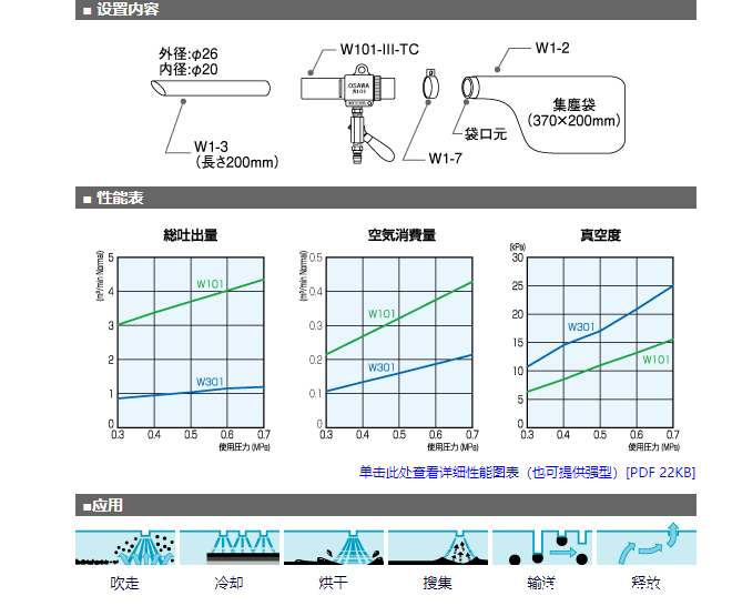 大泽W101-III-TC-A 是吸力套装。W101-III-TC主机也可以单独使用。请用它来吹、吸、运。我们有多种产品可以满足您的需求,例如可以代替镊子使用的超紧凑型铅笔型,适合从细小区域收集灰尘,以及可以进行全面喷砂的鼓风型.