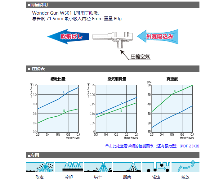 W501-L可用于吹吸。总长度 71.5mm 小吸入内径 8mm 重量 80g通过流动的压缩空气,沿“A”方向呈螺旋状喷射。由于这个动作,大量的外部空气从“B”吸入并与压缩空气结合,可以喷出大量的空气。吸气时请改变枪的方向并使用它。被吸入的物质和大量外界空气从“B”处被吸入并排放到“A”处,可用于输送和清洗。由于迷你型具有一体式吸嘴,因此无法改变吸嘴的方向