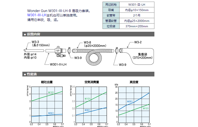 大泽 W301-III-LH-B 是吸力套装。W301-III-LH主机也可以单独使用。请用它来吹、吸、运。通过连接压缩机的压缩空气,是一款无噪音的吸尘器,可吸水、吸油、小碎石、金属屑等,吸力强劲。由于驱动源是压缩机的压缩空气,因此可以连续运行。此外,所有型号都配备了兼作过滤器的消音器,因此使用时非常安静。