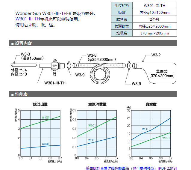 大泽 W301-Ⅲ-TH-B 是吸力套装。W301-III-LH主机也可以单独使用。请用它来吹、吸、运。通过连接压缩机的压缩空气,是一款无噪音的吸尘器,可吸水、吸油、小碎石、金属屑等,吸力强劲。由于驱动源是压缩机的压缩空气,因此可以连续运行。此外,所有型号都配备了兼作过滤器的消音器,因此使用时非常安静。