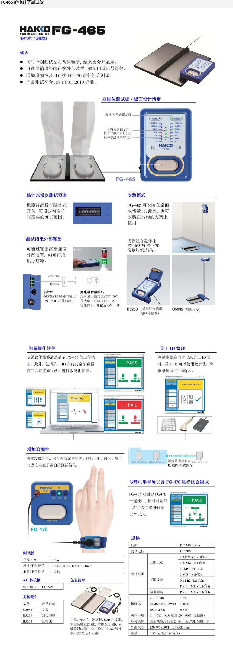 产品简介: 同时个别测试左右两只鞋子,结果会分开显示。可通过输出终端连接外部装置,如闸i ]或讯号灯等。增加追溯性及可连接FG-470进行组合测试。产品测试符合JIS T 8103:2010标准。