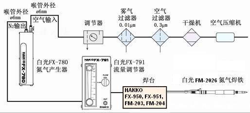 | (1) 白光 *(FX950 / FX951 / FM203 / FM204) + (2) 白光 FM2026 氮气焊铁 + (3) 白光 *FX780 氮气产生器 + (4) 白光 *FX791 氮气流量调节器 之氮气系统组合。 | ![]() |