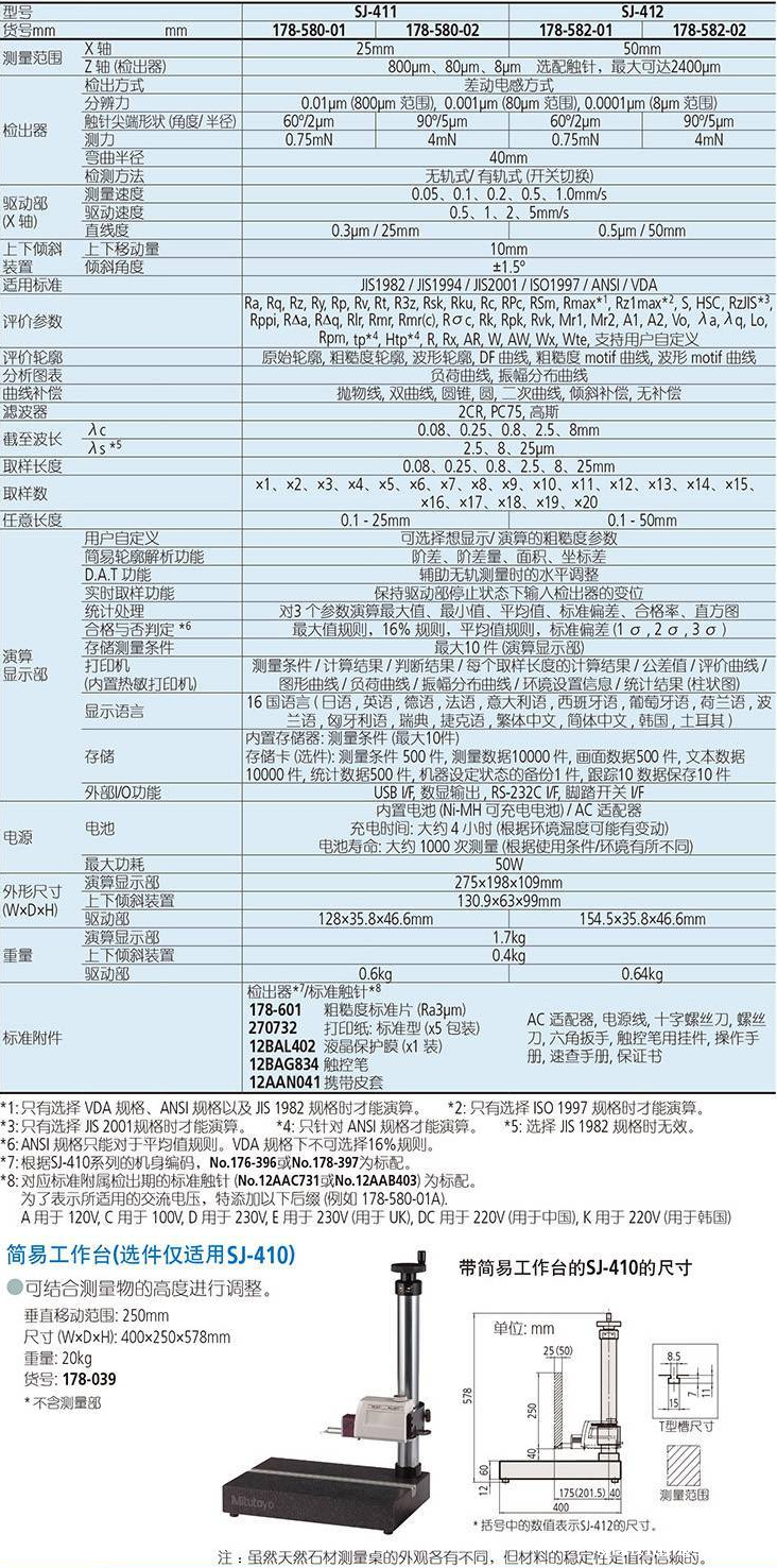 Surftest SJ-410小型表面粗糙度测量仪配备大型触摸屏彩色液晶显示器,实现直观操作和易用性。根据测量条件,在有轨测量和无轨测量方式间切换,以进行优化评价。通过宽幅范围的高精度检出器以及高直线度的驱动部,实现了超出同级水平的高精度测量。检出器 测量范围:800μm,分辨力:0.0001μm(8μm范围内时) 驱动器直线度/驱动长度:0.3μm/25mm(SJ-411)直线度/驱动长度:0.5μm/50mm(SJ-412)使用收集到的用于评价表面粗糙度的点群数据,可简易地进行轮廓形状解析(阶差、阶差量、面积、坐标差)。可对在轮廓形状测量仪上不能分析的细微形状进行分析。