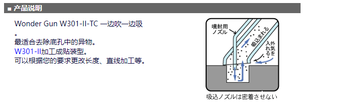 日本进口W301-II-TC 一边吹一边吸适合去除底孔中的异物。W301-II加工成贴装型。可以根据您的要求更改长度、直线加工等。
