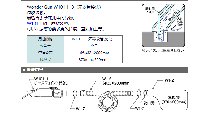 日本进口 W101-II-B(无软管接头)边吹边吸。适合去除底孔中的异物。W101-II加工成贴装型。可以根据您的要求更改长度、直线加工等。