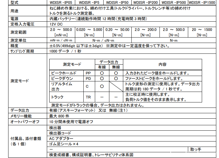 可显示各种信息的彩色显示器USB和RS232C数据输出均为标准设备500mN·m(0.5N·m)~1500N·m的各种系列产品使用可选的无线模块无线传输测量数据多可以为 10 个通道设置通过/失败条件等数值。通过/失败判断的易于理解的彩色显示内置电池驱动WDISR系列包括WDISR-IP05、WDISR-IP5、WDISR-IP50、WDISR-IP200、WDISR-IP500和WDISR-IP1500。