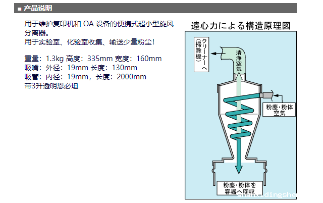 用于维护复印机和 OA 设备的便携式超小型旋风分离器。用于实验室、化验室收集、输送少量粉尘!重量:1.3kg 高度:335mm 宽度:160mm吸嘴:外径:19mm 长度:130mm吸管:内径:19mm,长度:2000mm带3升透明恩必坦