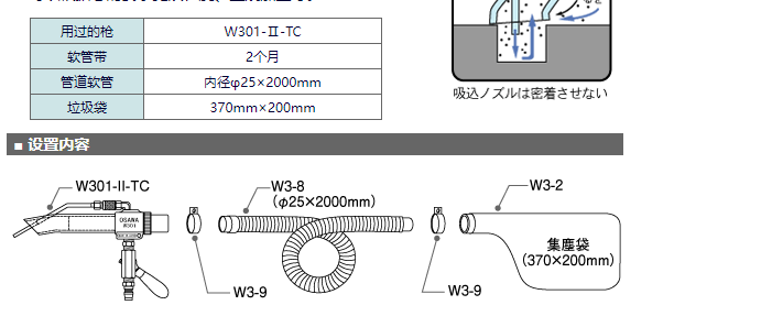 W301-II-TC-B 一边吹一边吸。适合去除底孔中的异物。W301-II加工成贴装型。可以根据您的要求更改长度、直线加工等。它是一个小内径为Φ11的圆柱体,通过改变内部吸嘴的方向,既可用于吹气和吸气,又可用于输送、收集、冷却和排气。Wonder Gun W301-II-TC-B 一边吹一边吸。适合去除底孔中的异物。W301-II加工成贴装型。可以根据您的要求更改长度、直线加工等。此外,枪的形状使其易于握持且易于操作。它可用于广泛的用途,例如清洁切削粉尘和输送颗粒。