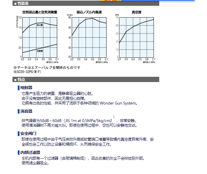 静音吸尘器SC20-32PG可以吸入压缩空气(compressor air)作为驱动源。强力收集水、油、污泥、谷物、小砾石、金属碎片等传统工业清洁剂无法充分收集的物质。非常适合任何工作场所。2级结构/多重过滤器!长时间连续使用OK!吸力强、降噪的万能吸尘器。重量 6kg 高度 390mm 宽度 320mm吸嘴:外径 32mm 长度 400mm吸管内径 32mm 长度 2000mm 适用于20 升提桶罐。单独准备一个密封容器。SC20-32G带 20 升油箱,也可提供标准型,