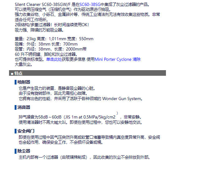 Silent Cleaner SC60-38SGW/F 是在SC60-38SG中集成了灰尘过滤器的产品。可以使用压缩空气(压缩机空气)作为驱动源进行抽吸。强力收集谷物、小砾石、金属碎片等,传统工业清洁剂无法有效收集这些物质。非常适合任何工作场所。2级结构/多重过滤器!长时间续使用OK!吸力强、降噪的吸尘器。重量:23kg 高度:1,011mm 宽度:550mm