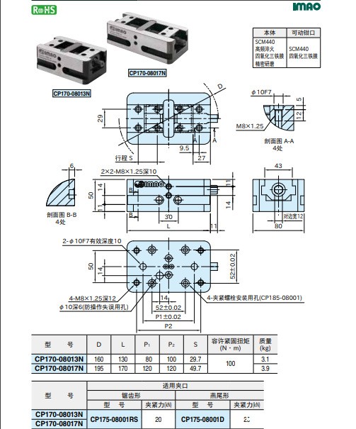 日本IMAO今尾CP170-08017N中心虎钳CP170-N五轴加工用虎钳夹具可以根据对心机构,夹紧用余料很薄的工件也能自定心加工。(能适应单侧夹紧余料厚度为0.4mm以上的工件。)