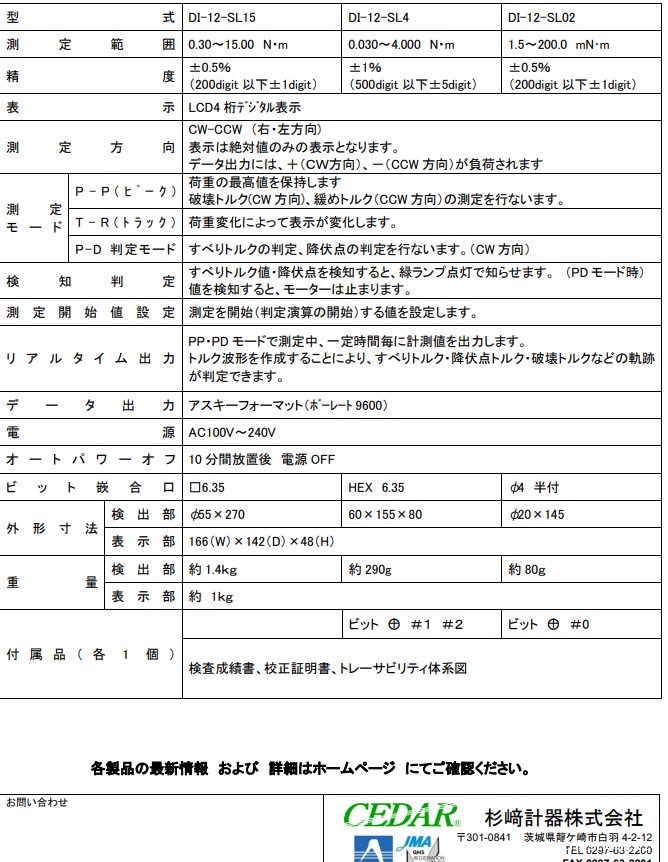 产品简介: DI-12 系列测量拧紧的螺丝用多大的力拧紧。通过高精度捕捉滑动的发生并测量其扭矩,现在可以测量拧紧螺钉的扭矩值。用于产品的抽检和动力驱动器输出力矩的设定和管理。通过电机驱动顺畅地拧紧工作判断后自动停止功能,无需重新拧紧测量拧紧螺丝的扭矩值 扭矩曲线的创建(制动扭矩、极限扭矩、屈服点扭矩等的测量) DI-12系列包括DI-12-SL02、DI-12-SL4和DI-12-SL15。