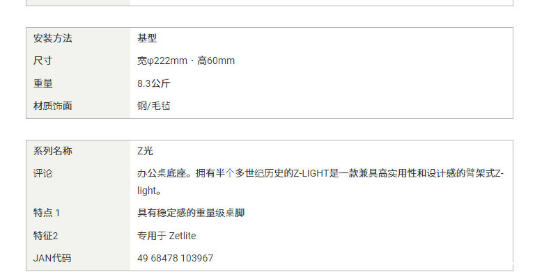 系列名称 Z光评论 办公桌底座。拥有半个多世纪历史的Z-LIGHT是一款兼具高实用性和设计感的臂架式Z-light。特点 1 具有稳定感的重量级桌脚特征2 专用于 Zetlite基型尺寸 宽φ222mm・高60mm重量 8.3公斤材质饰面 钢/毛毡
