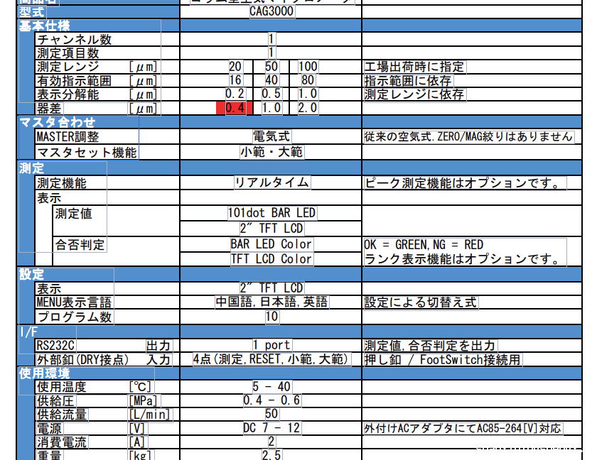 规格备注Specificat ionsNotes商品名称电子柱式气动量仪型号CAG3000基本规格频道数目测量项目数测量范围[μm]2050100出厂时有效显示范围[μm]164080根据显示范围分辨率μ m0.2,0.5根据测量范围误差μm0.4 1.02.0校准标准件校对调整没有传统的空气式,零位/倍率旋钮校对调整功能下限规..上限规测量测量功能峰实时峰值测量功能为可选项。显示.测量值101dot BAR LED2”TFT LCD