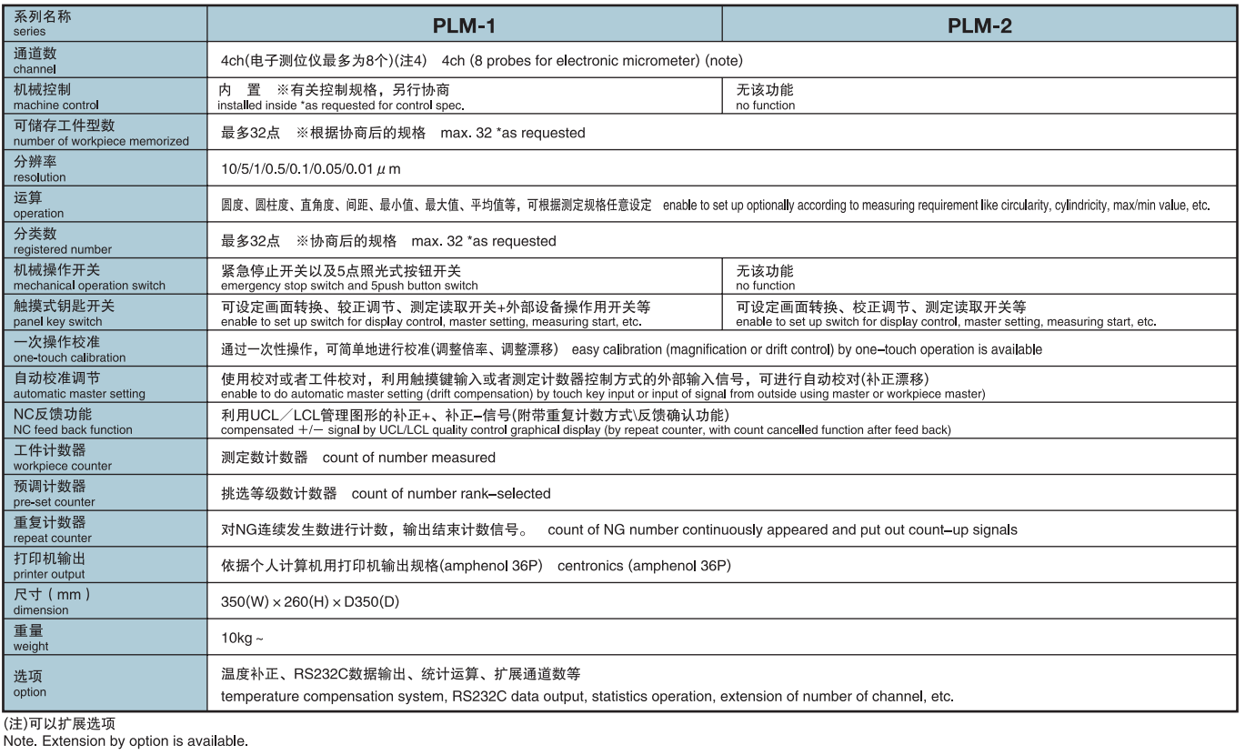 PLM,备有机械顺序控制器和机械操作板功能的PLM-1系列,以及不具有机械控制部分的PLM-2系列。每种系列的空气·电气测微仪,均可构筑最大4通道(电气测微仪的检测仪最多8通道)的测定系统。 PLM-1系列,内置操作板和机械控制JI困序控制器,该机型最适合用作自动测定机的控制器。此外,显示部分采用了8色显示彩色LCD触摸板,除了显示测定值,还可用于判定的彩色显示、条状图表、管理圈圈表显示等,可同时提高视觉辨认度和操作性。