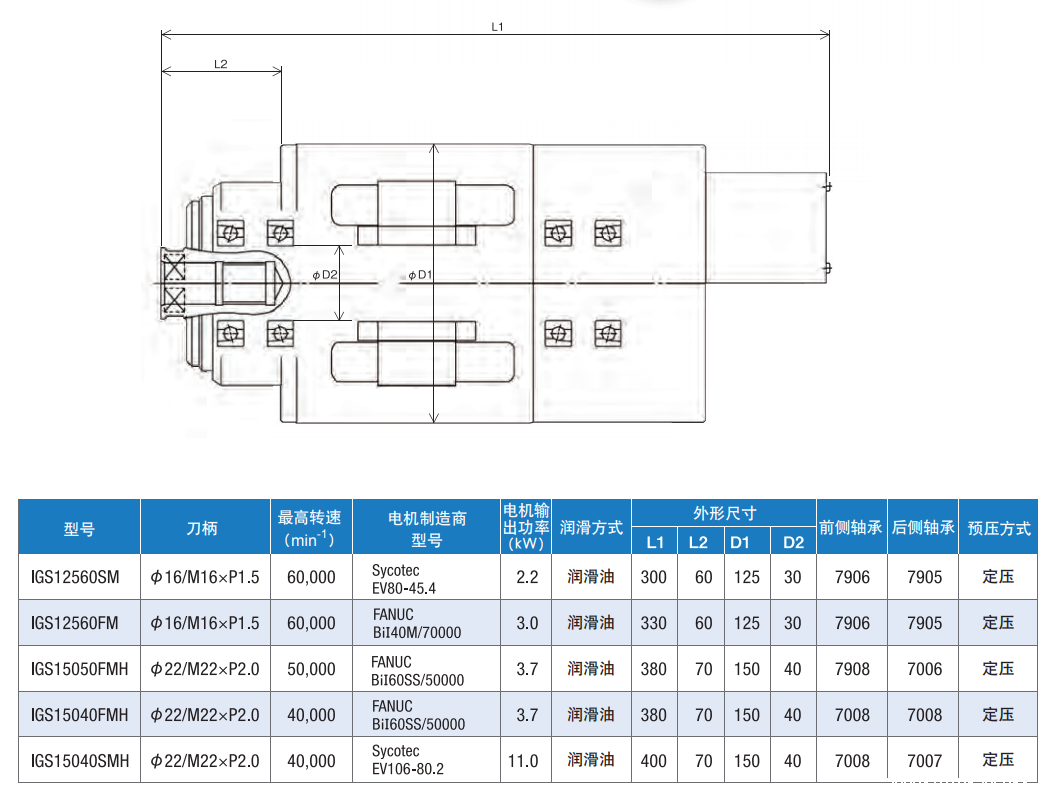 产品简介: IGS12560SM凭借高精度及高速旋转,实现高精度内圆磨削。 电机内置规格的内圆磨床用高速主轴。考虑到可能未配备NC控制装置, 除了FANUC制电机规格外, 还备有Syco tec(德国) 制电机规格,可满足客户的广泛需求。