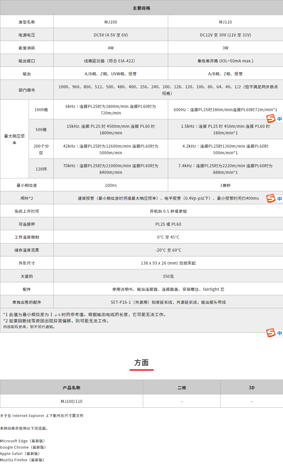 产品简介: 可分为40个格至最大1000个格当与可选的 Digiruler Head Unit PL25 和 Scale Unit SL110/130(基本波长 = 5 mm)或 PL60 和 Scale Unit SL331(基本波长 = 2 mm)结合使用时,输出分辨率为 2 µm 至 125 µm 的 A/B 相位信号). 电源电压 MJ100:5V(4.5~6V)、MJ110:12~30V(11~31V) MJ100以数字尺的再现波长(PL25=5mm,PL60=2mm)为一个周期同时输出UVW相位。