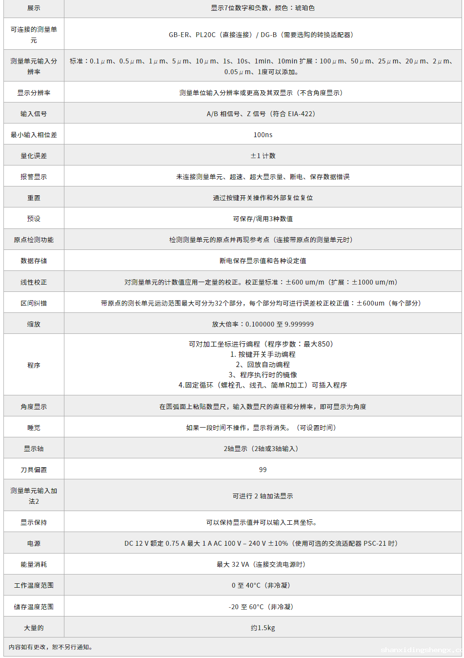 镁鳞片配备车床功能小显示量切换区间纠错数据存储重置/预设测量单元原点检测程序功能缩放车床规格(工具坐标/加法功能)电源需要一个可选的交流适配器 (PSC21A)。配备车床功能小显示量切换区间纠错数据存储重置/预设测量单元原点检测程序功能
